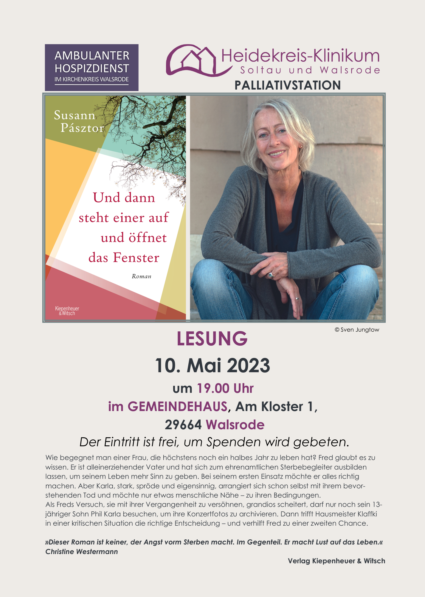 Am 10. Mai findet im Rahmen des Jubiläums der Palliativstation eine Lesung von der Autorin Susann Pasztor im Gemeindehaus in Walsrode statt. Der Eintritt ist frei.