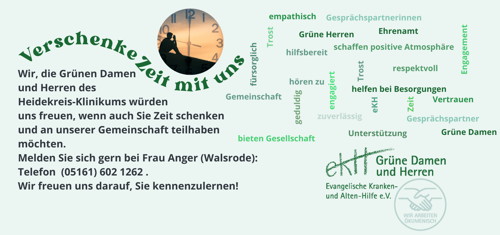 Seit vielen Jahren sind wir, die „Grünen Damen und Herren" der evangelischen und ökumenischen Krankenhaushilfe, ein fester Bestandteil des Heidekreis-Klinikums. An beiden Standorten kümmern wir uns um die individuellen Sorgen, Nöte oder auch Wünsche der Patientinnen und Patienten.